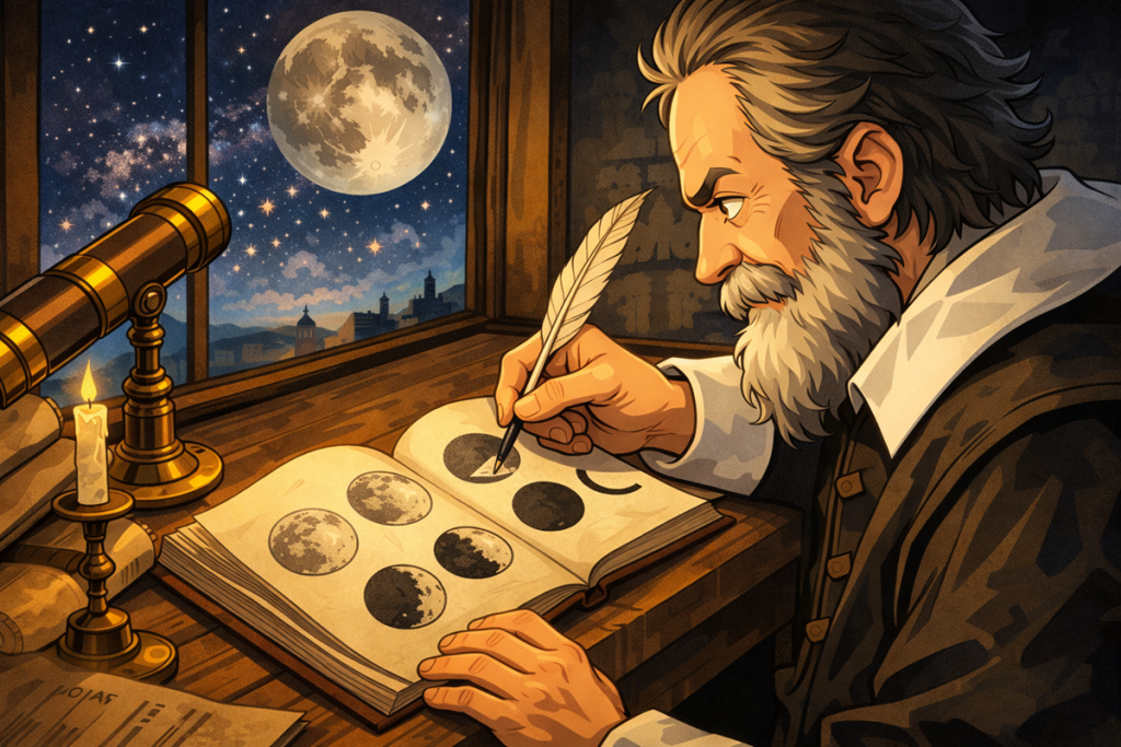 It was during this time that he constructed a telescope with 18–20 times magnification. Through it, he demonstrated that the Milky Way was composed of countless stars; he observed the irregular surface of the Moon, the rings of Saturn, sunspots, the phases of Venus, and—most remarkably—the moons orbiting Jupiter. Those moons convinced him that not everything goes around the earth, and the earth may not be the center of everything.
